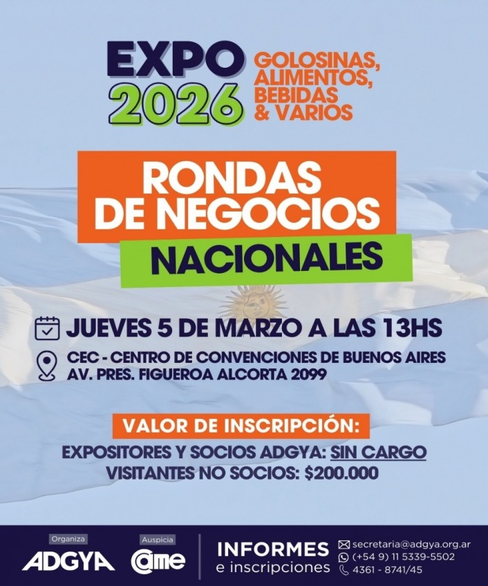 La Confederación Argentina de la Mediana Empresa (CAME), junto a la Asociación de Distribuidores de Golosinas, Galletitas y Afines distribuidores (ADGYA), invita a empresas de la red federal a participar de la Ronda de Negocios Expo 2026: Golosinas, Alimentos, Bebidas y varios, a realizarse el 5 de marzo, a partir de las 13hs, en el Centro de Convenciones de Buenos Aires, sito en Av. Pres. Figueroa Alcorta 2099, CABA.